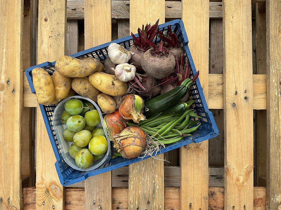 July: The basket of fruit and veg kindly provided to me by the guys at the allotments off Rhodesia Road. I can still taste the sweet greengages.